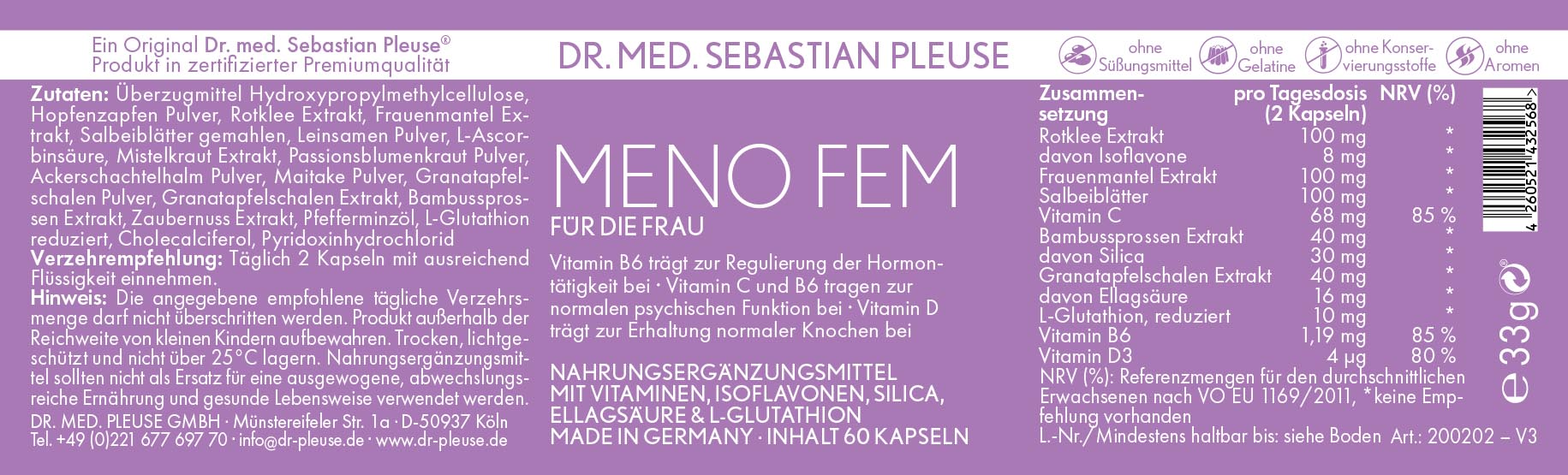 Dr. Pleuse hat bei der Rezeptur von Meno Fem über unseren kulturellen Tellerrand hinausgeblickt und sich zusätzlich an asiatischen Ansätzen orientiert. Wo man in unseren Breiten zu Hopfen, Rotklee und Ackerschachtelhalm greift, werden in Asien häufig Bambussprossen und Maitake-Pilze verwendet. In Meno Fem sind beide Welten vertreten! Dazu kommen hochwertiger Frauenmantel, Zaubernuss-Extrakt und Mistelkraut.