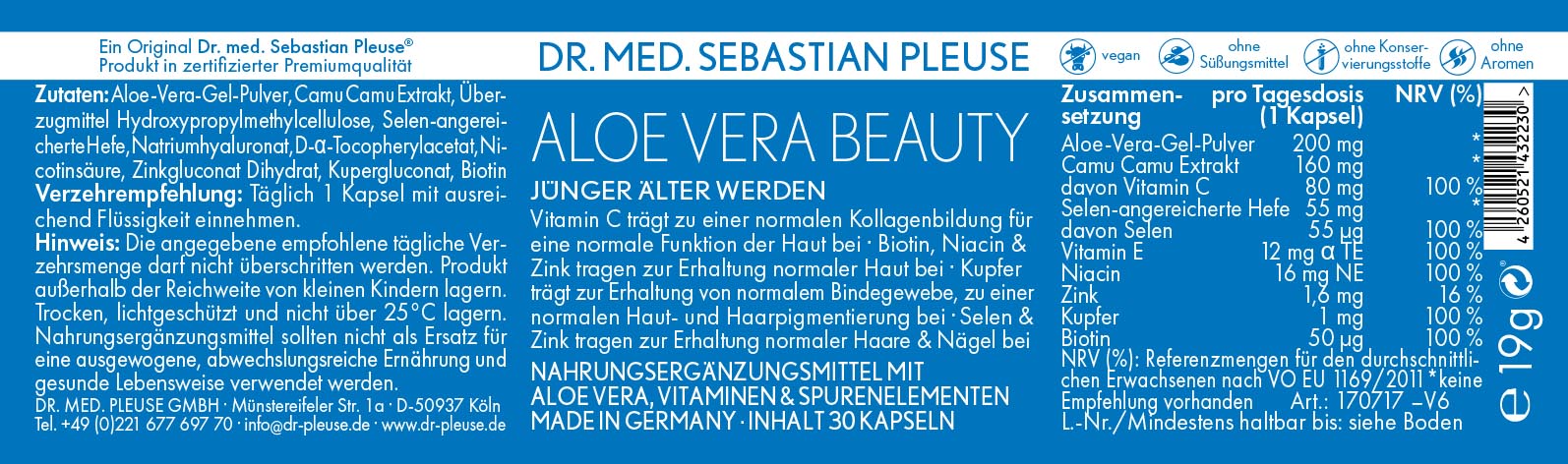 ALOE VERA BEAUTY bietet Ihnen eine ganzheitliche Schutzformel für Haut, Haare und Nägel mit Feuchtigkeit, Antioxidantien und Nährstoffen. Die innovative Beauty-Rezeptur enthält Aloe Vera, Camu Camu, Zink, Selen, Vitamin E, Niacin, Kupfer und Biotin.