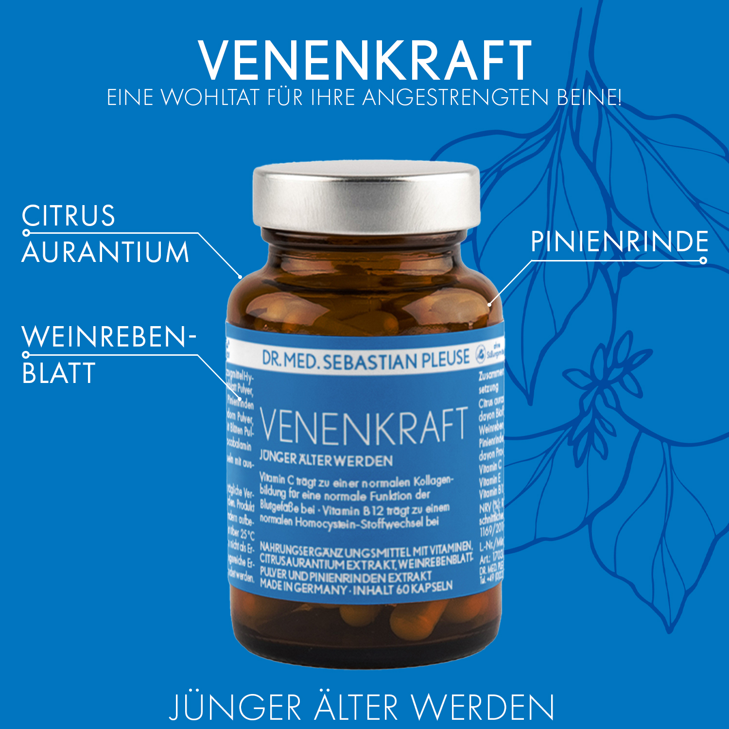 Venenkraft unterstützt Ihre Venen mit Citrus aurantium-Extrakt, Bio-Flavonoiden, Weinrebenblatt, Pinienrinde und einer intelligenten Auswahl an Vitaminen.