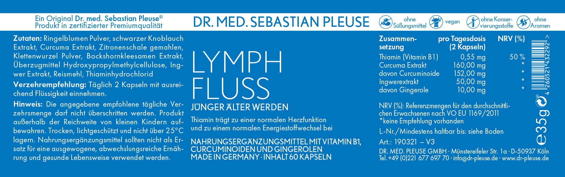 LYMPHFLUSS von Dr. med. Sebastian Pleuse liefert eine innovative rein pflanzliche Rezeptur für ein unbeschwertes Körpergefühl. Basierend auf Ringelblume, Klettenwurzel, schwarzem Knoblauch, Ingwer und Zitrone ist es eine effektive Nahrungsergänzung für die Übergangszeiten und die warmen Monate.