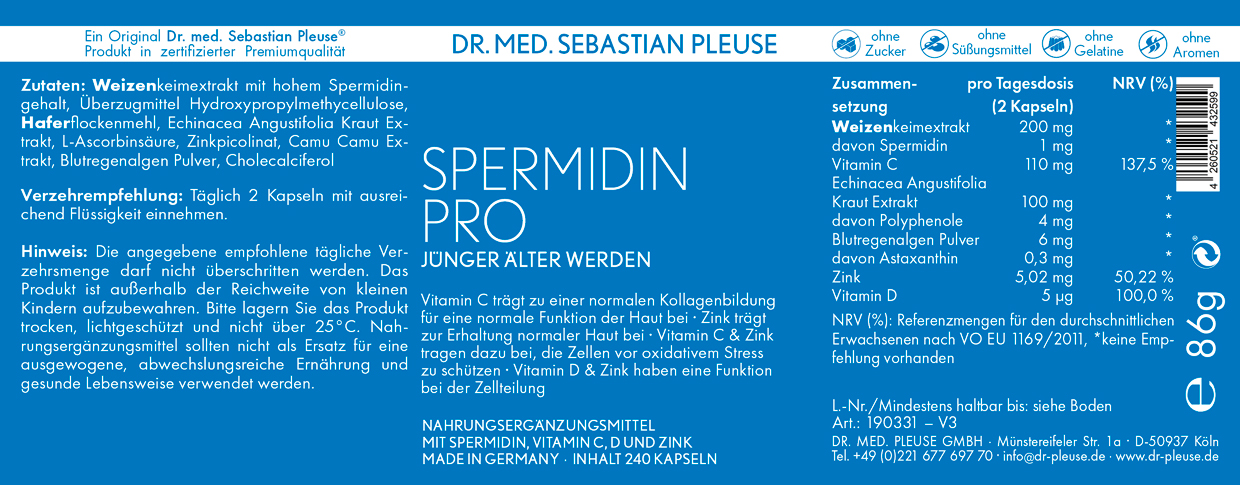 Es liefert dem Körper eine extra große Menge hochwertiges Spermidin sowie stimulierende Pflanzenstoffe wie Astaxanthin und Polyphenole. Außerdem enthält SPERMIDIN PRO die Vitamine C und D und das Spurenelement Zink. So wird der Effekt des Spermidins optimal gefördert, denn Vitamin D und Zink unterstützen die Zellteilung und Vitamin C und Zink schützen die Zellen vor sogenanntem „oxidativem Stress”, also vor vorzeitiger Alterung.