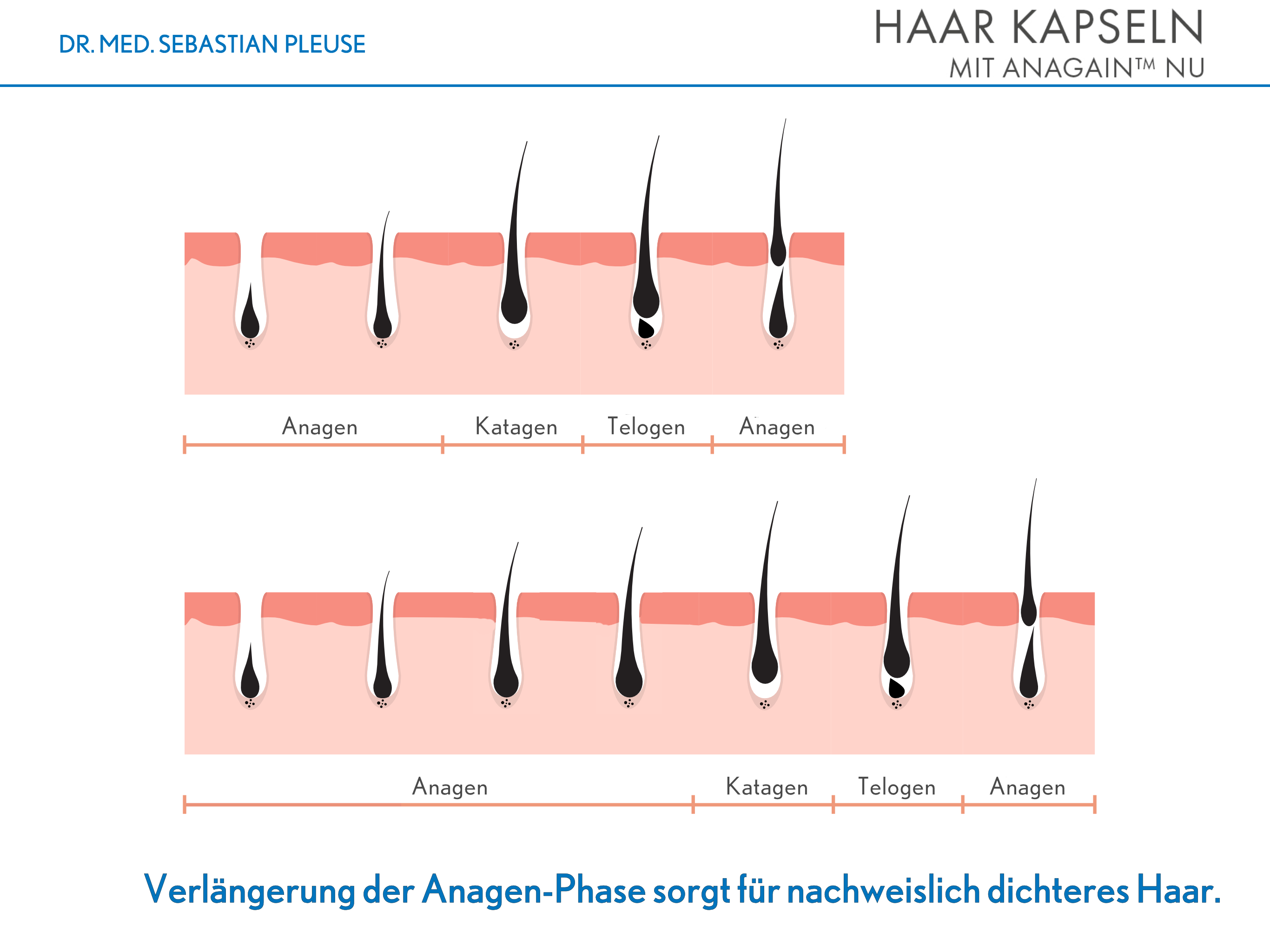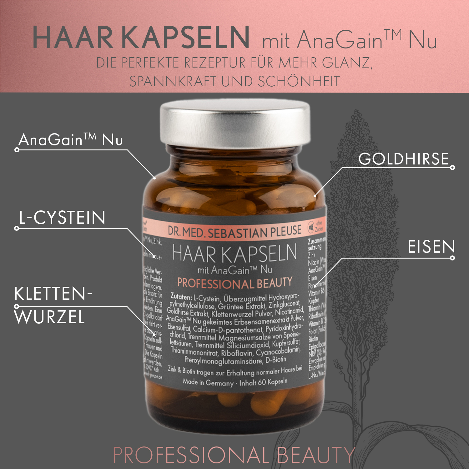 Die Kapseln enthalten den Markenrohstoff AnaGain™ Nu, der auf Erbsensprossen aus biologischem Anbau basiert. Erbsensprossen enthalten hochkonzentrierte sekundäre Pflanzenstoffe, die dem Schutz und dem Wachstum der jungen Pflanzen dienen. Diese Eigenschaften nutzt AnaGain™ Nu, um die sogenannte dermale Papille zu stimulieren. Die dermale Papille ist ein in der Haut eingelagerter Bereich aus Bindegewebe, feinen Blutgefäßen und Nervenfasern, der die Haarwurzel umgibt. Dieser Bereich ist für die Nährstoffversorgung der Haarwurzel zuständig und steuert den Wachstumszyklus des Haares. Wird die dermale Papille angeregt, reaktiviert dies das Haarwachstum.