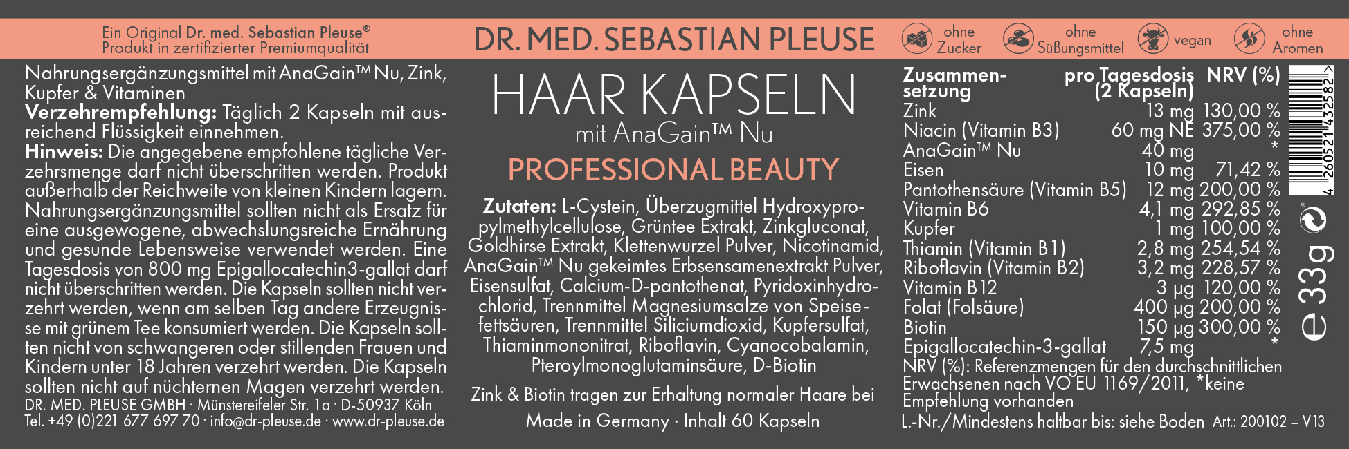 Pro Tagesdosis (2 Kapseln): Zink 13 mg, NRV 130 % - Niacin (Vitamin B3) 60 mg NE, NRV 375 % - Anagain™ Nu 40 mg, NRV** - Eisen 10 mg, NRV 71,42 % - Pantothensäure (Vitamin B5) 12 mg, NRV 200 % - Vitamin B6 4,1 mg, NRV 292,85 % - Kupfer 1 mg, NRV 100 % - Thiamin (Vitamin B1) 2,8 mg, NRV 254,54 % - Riboflavin (Vitamin B2) 3,2 mg, NRV 228,57 % - Vitamin B12 3 µg, NRV 120 % - Folat (Folsäure) 400 µg, NRV 200 % - Biotin 150 µg, NRV 300 % - Epigallocatechin-3-gallat 7,5 mg, NRV**NRV (%): Referenzmengen für den durchschnittlichen Erwachsenen nach VO EU 1169/2011, **keine Empfehlung vorhanden