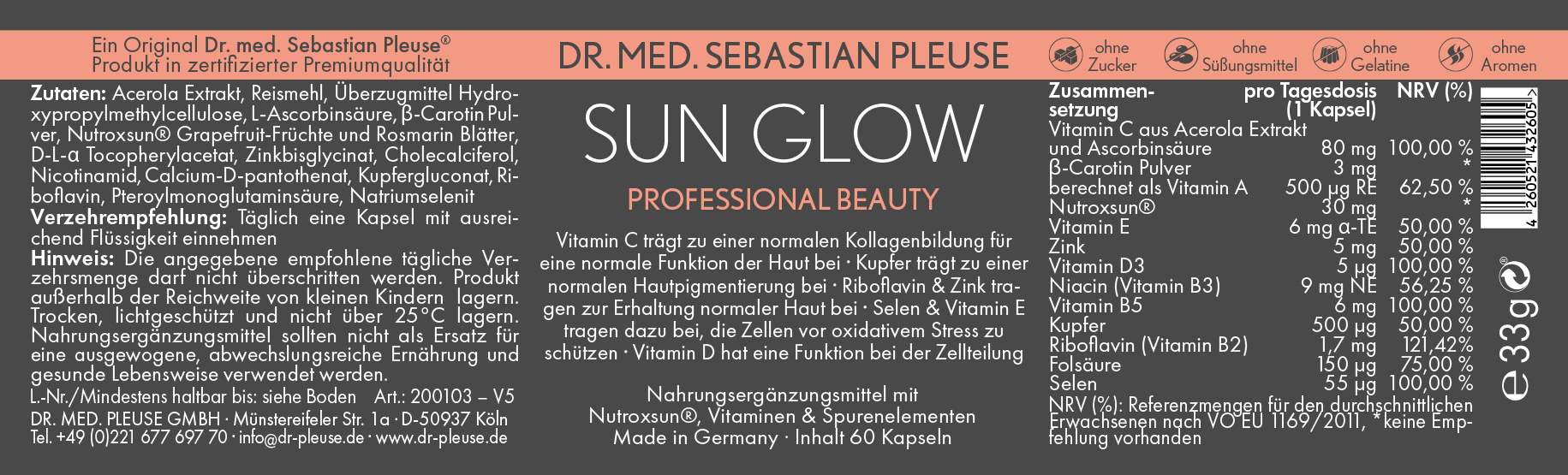 SUN GLOW bieten Ihnen einen innovativen Komplex aus dem wissenschaftlich getesteten Markenrohstoff Nutroxsun®, Beta-Carotin und wichtigen Vitaminen und Spurenelementen für Ihre Haut.
