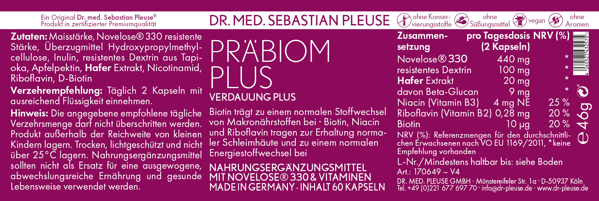 Es liefert Ihnen täglich Ballaststoffe und Vitamine, die speziell auf den Darm und die Versorgung des Mikrobioms zugeschnitten sind. Zentraler Bestandteil von PRÄBIOM PLUS ist der hochwertige Markenrohstoff Novelose®. Dieser bietet eine besonders resistente Stärke, die bis in die hinteren Darmabschnitte erhalten bleibt und so den dort lebenden Bakterien als Nahrungsquelle dient. Gerade bei den Bakterien im hinteren Darmabschnitt kommen oft nur noch wenige Nährstoffe an. In Studien zeigte sich, dass Novelose® bei Störungen des Mikrobioms eine deutliche Verbesserung erzielte!