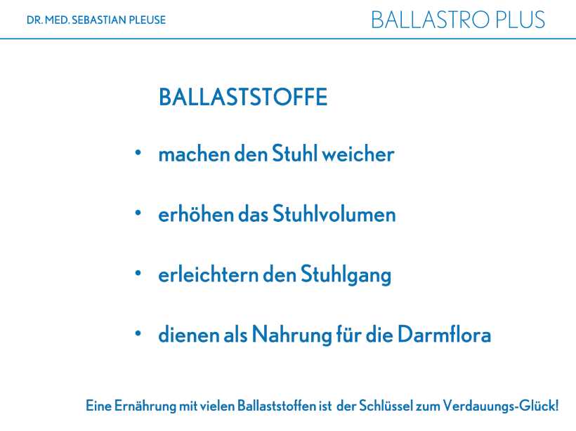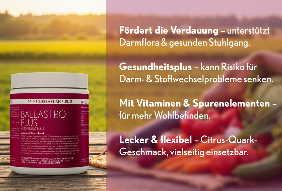 Ballastro Plus ist ein wohlschmeckender Drink, der Sie mit ausgesuchten löslichen und unlöslichen Ballaststoffen natürlicher Herkunft versorgt.